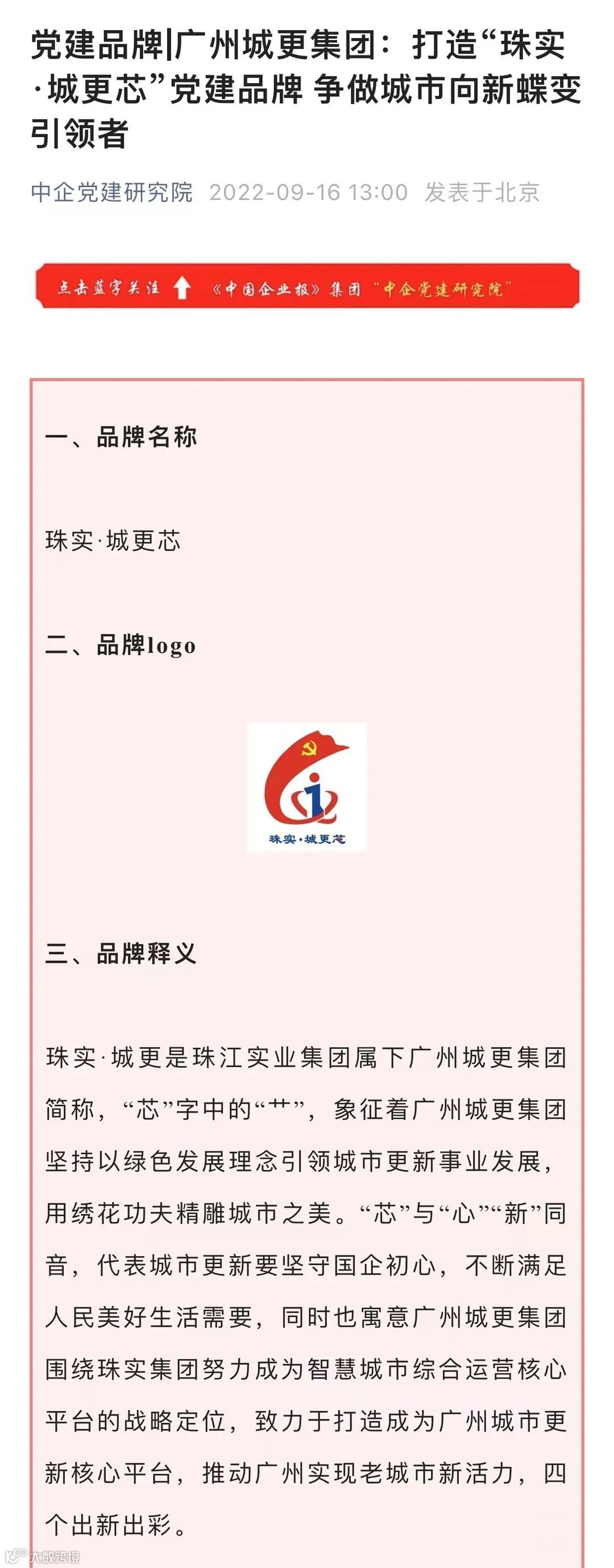 2022年9月16日,中企党建研究院平台刊登了广州城更集团党建品牌《广州城更集团:打造“珠实·城更芯”党建品牌 争做城市向新蝶变引领者》。