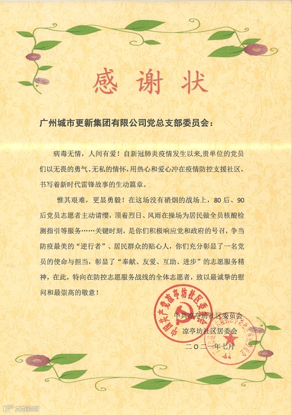 对接仪式上,城更集团党总支承接了“幸福共享、融心惠民”微项目、认领了困难家庭“微心愿”,与社区困难家庭开展结对帮扶,我司党员代表作表态发言。随后,六榕街凉亭坊社区向城更集团颁发社区突出贡献单位感谢状,感谢城更集团党总支在抗击广州新一轮新冠肺炎疫情期间闻令而动,主动出击,先后组织26名公司党员突击队成员多次支援凉亭坊社区防疫抗疫志愿服务,用热心和爱心冲在疫情防控支援社区的最前线,积极为基层社区织密织牢疫情防控网贡献国企力量。