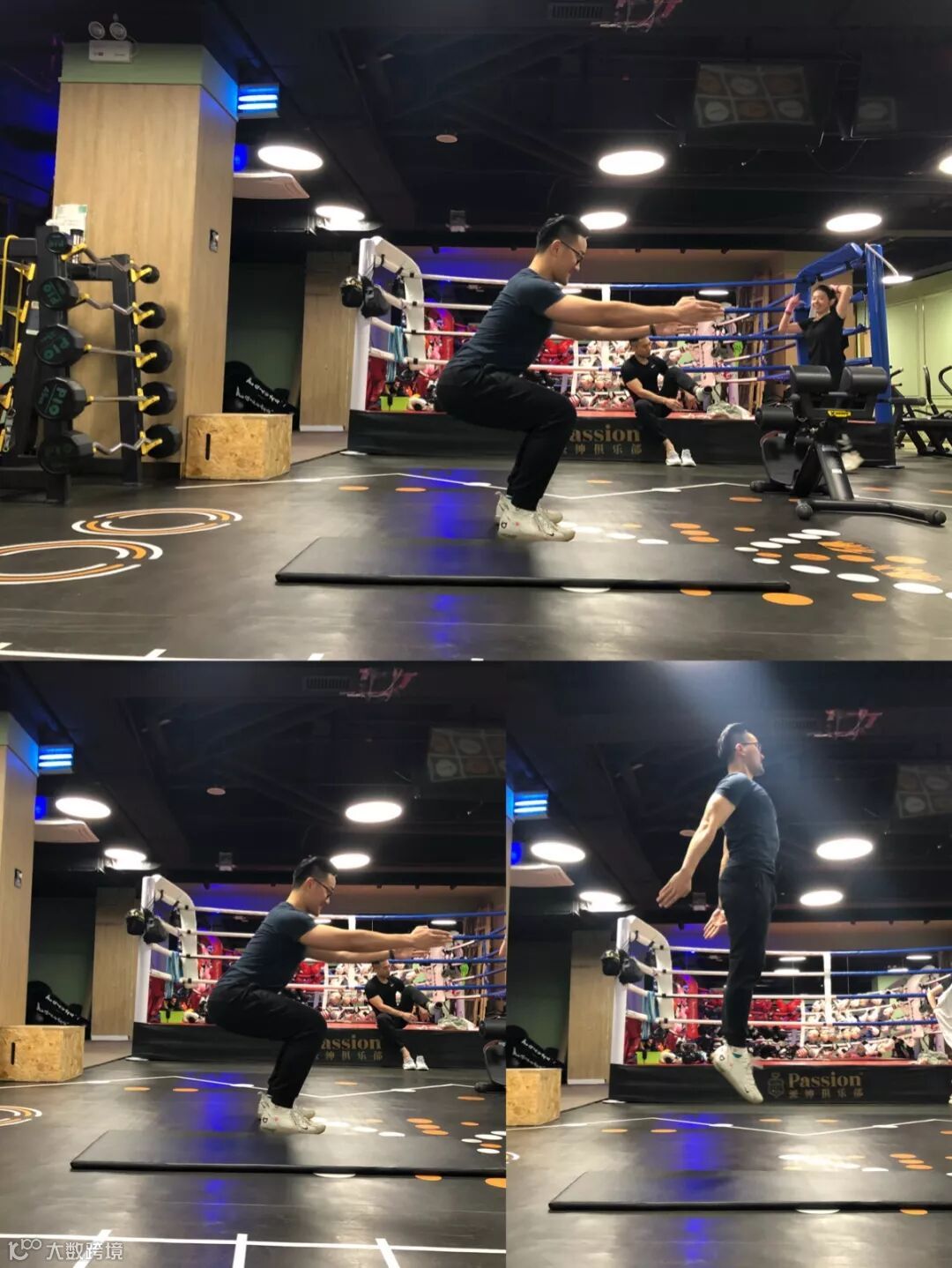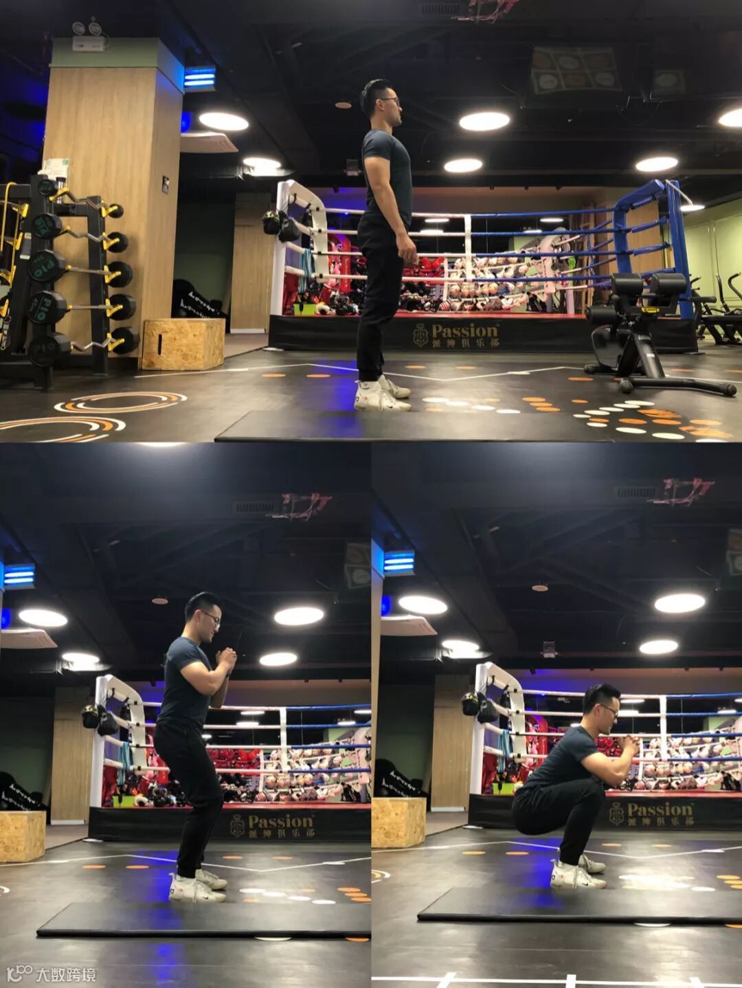 1.深蹲至大腿与地板平行,挺胸向前看;