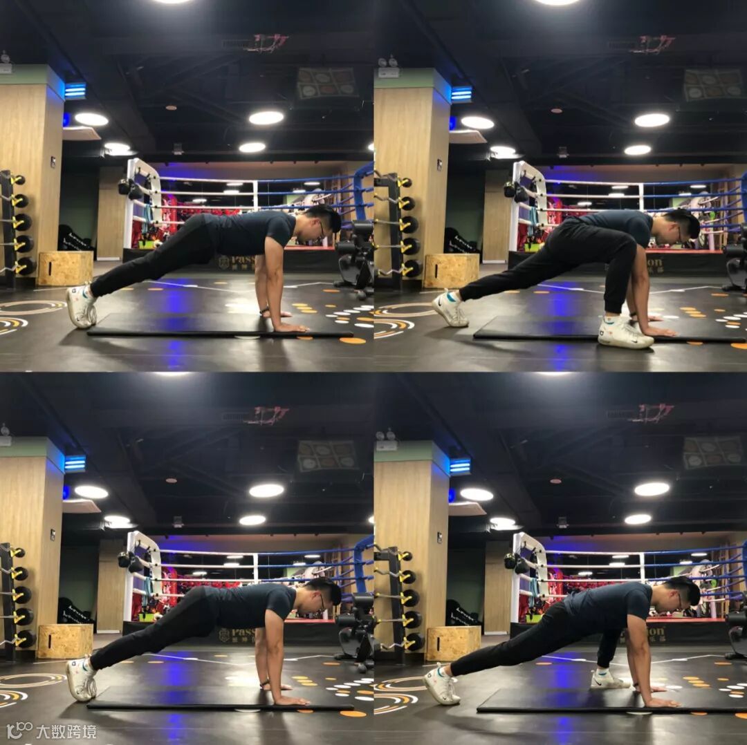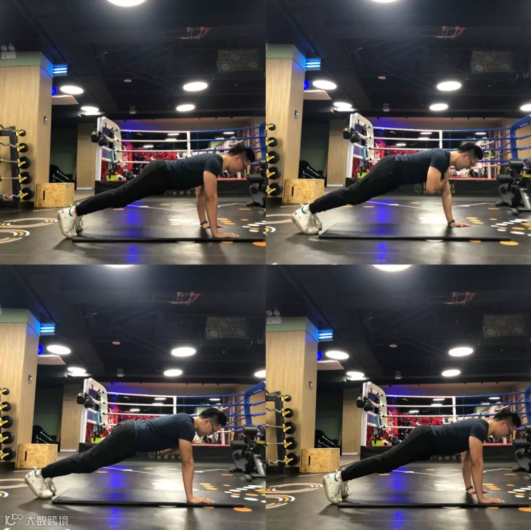 2.整个动作中,身体要始终保持平板姿势,身体核心部位要保持平直紧绷;