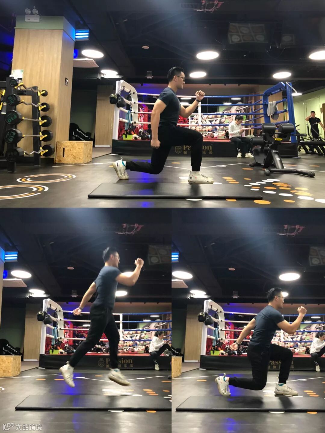 3.起跳后,交换双腿,前腿换到后面,后退换到前面,双臂也自然交换位置;