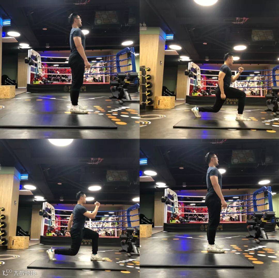 1.保持直立姿势,将一条腿向后伸,下蹲至前腿呈90度;