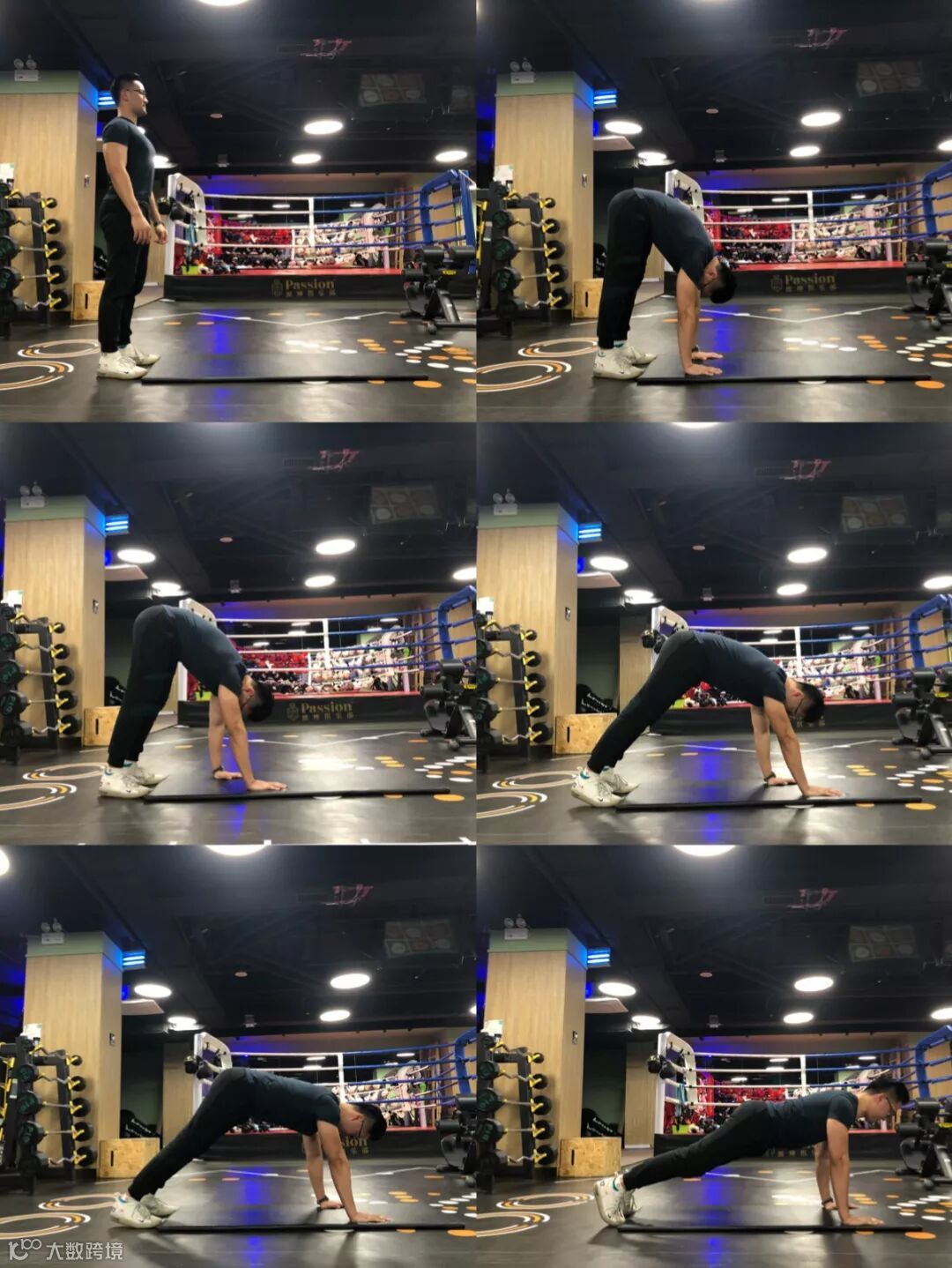 1.开始时呈俯卧撑姿势,右脚从身体侧面向前伸至右手处,返回,伸左脚;