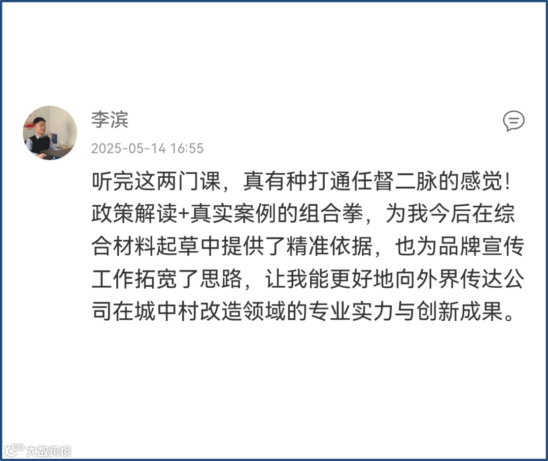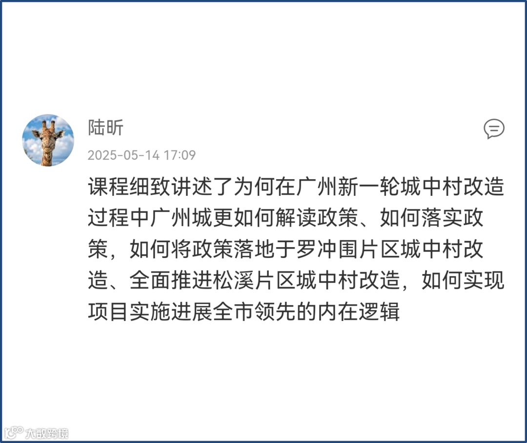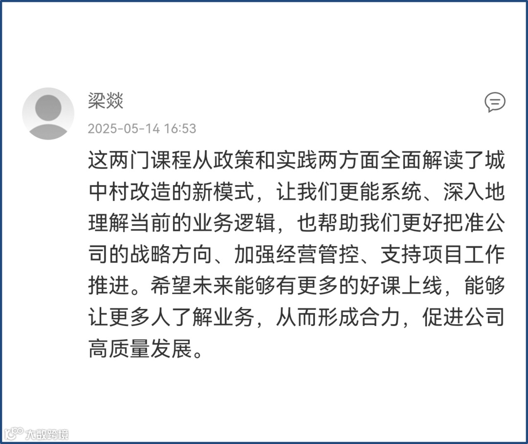 本次上线的课程聚焦公司核心业务、重点项目,通过“政策权威解读+实战案例剖析”,深度挖掘公司在城市更新领域的先发优势,系统呈现了“城市更新政策”“城中村改造模式”“松溪片区城中村改造案例实践”等核心知识,是公司独立开发制作课程、建立内部知识萃取机制的一次有效尝试,标志着公司智库建设迈出关键一步。