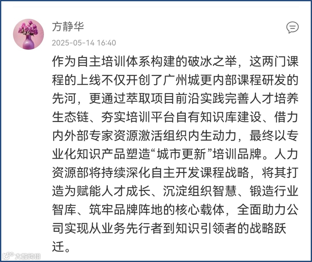 汇江河者成海,萃星火者燎原。公司将以本次课程上线为起点,聚焦主业持续优化内部课程制作水平,推动内部稀缺课程、行业前沿知识进行课程开发与萃取,完善公司内部知识库建设,将其打造为赋能人才成长、沉淀组织智慧、锻造行业智库、筑牢品牌阵地的核心载体。同时,以点带面组建一支兼具专业性、创造性、分享性、实践性的内部讲师队伍,进一步推动课程体系扩容,建立从项目实践到课程开发、从经验沉淀到知识共享的知识循环闭环机制,将企业40年沉淀转化为可传承的智力资产,为城市更新领域打造具有行业引领性的培训资源品牌,为公司“二次创业”再出发提供坚实的人才动能与知识支撑,助力公司实现从业务先行者到知识引领者的战略跃迁。