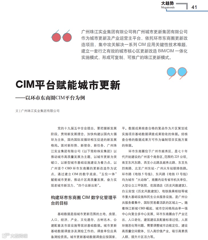 近日,住房和城乡建设部信息中心主办的《中国建设信息化》杂志刊发广州市“新城建”工作系列成果,由珠实集团提供的《CIM平台赋能城市更新——以环市东商圈CIM平台为例》获得发布。