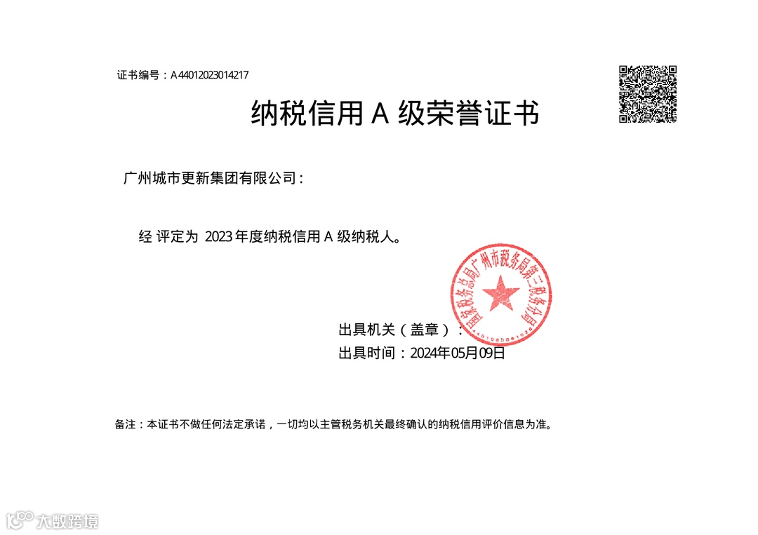 广州城更连续五年获评A级纳税人,充分展现了税务机关对公司诚信经营、依法纳税的高度认可,以及对公司税收综合管理水平的充分肯定。随着我国信用体系建设的深入推进,纳税信用已成为企业参与市场竞争的重要信用资产。荣获这一称号将有助于广州城更在税收服务、生产经营、投资发展、融资授信等方面获得更多政策支持和市场认可。