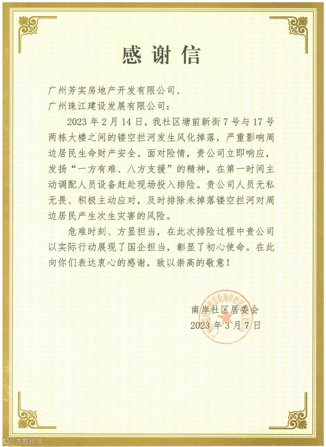 民生事务无小事,群众利益是大事。芳实公司以实际行动做到急群众之所急,想群众之所想,一切以群众利益为重。3月7日,广州城更芳实公司收到了南岸社区居委会的感谢信及锦旗,信中对芳实公司面对险情,主动应对,第一时间调配人员及设备赴现场排除险情的精神和行为,表达了衷心的感谢和崇高的敬意。