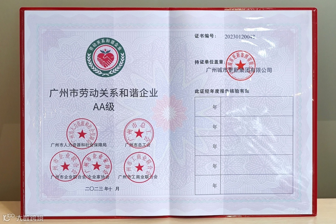 劳动关系和谐是企业高质量发展的重要内生动力。广州城更将珍惜荣誉,继续以建立规范有序、公平合理、互利共赢、和谐稳定的新型劳动关系为目标,与广大职工携手并进,共同开创城市更新事业更加美好的未来!