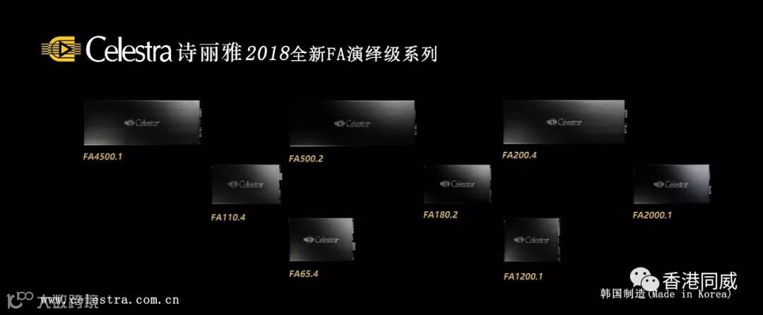 Celestra 诗丽雅全新 FA 系列韩国制造( Made in Korea )高电流競赛级別大功率功放,初段难免有种似曾相识,又感陌生的矛盾心情。经众兄弟不断地转换CD碟,我们终于听到一把建基于传统Celestra诗丽雅功放之声底,而音响画面更全面高清化的现代声音。