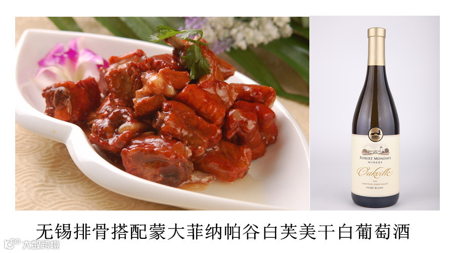 无锡排骨又叫三凤桥酱排骨,采用精选肋排,色泽酱红,油而不腻,骨酥肉烂,香气浓郁,甜咸适口,轻咬一口,唇齿留香。这款蒙大菲纳帕谷奥克维尔白芙美干白葡萄酒,青柠的清新香气,番石榴和柠檬马鞭草的清脆,白兰瓜、柠檬香草和金银花的成熟风味,夹杂着些许香料气息,令这道菜的香味更加复杂,让人垂涎欲滴,同时浓浓的酸度和回味的柑橘风味,缓解了菜品的甜咸。