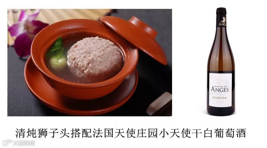 清炖狮子头为江苏名菜,以小五花肉为主要原料,加入蟹肉、菜心、料酒、蟹黄、葱粒、生粉、姜汁等调拌成肉丸后入砂锅清炖三小时而成。整道菜肉汤清澈见底,口感松软,肥而不腻,入口即化,蟹肉鲜香,青菜酥烂清口,食后清香满口,齿颊留香。这款法国罗纳河谷AOC天使庄园小天使干白葡萄酒清新的酸度可以让狮子头的鲜味更加突出,同时其馥郁芬芳的果香让整道菜别具一格。