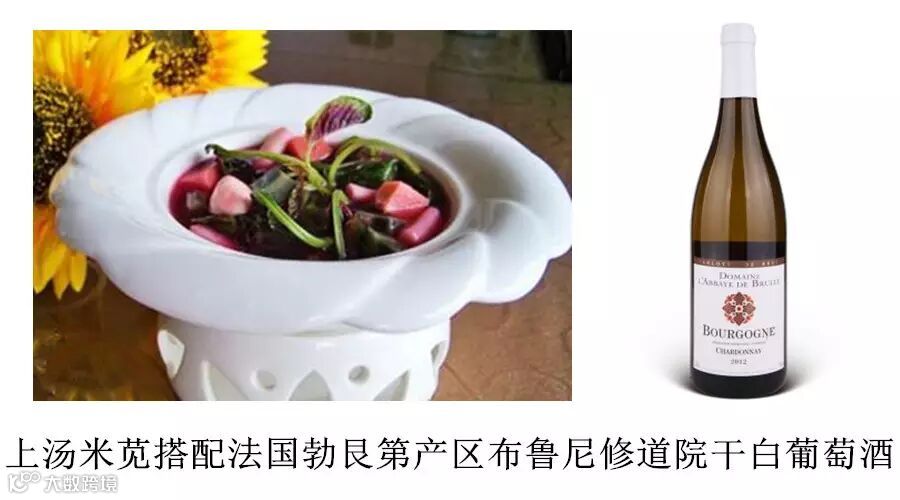 用独特上汤炖制而成的上汤米苋,浓香润口,既有汤的鲜嫩又有苋菜的清新爽口,整体搭配起来营养丰富,口感独特。这道菜的特点是口感丰润、香浓,而这款法国勃艮第产区布鲁尼修道院干白葡萄酒,散发着清新的桃子馨香与香草气息,入口饱满柔滑,酸度适中,尾韵悠长,与菜肴的香浓丰润有着异曲同工之妙。