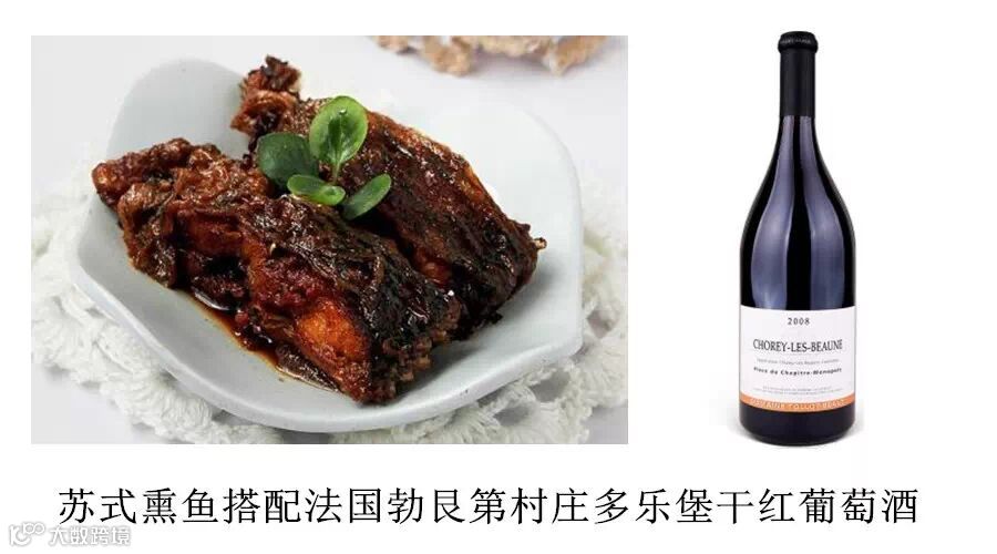 熏鱼,配以各种天然香辛料,先炸后煨纯手工制作而成。甜中带着咸,咸中带着鲜。可做冷拼也可入汤进行调味之用,外观呈琥珀色,滋味醇厚,入口软绵紧密。搭配法国勃艮第村庄多乐堡俏雷伯恩村教堂小屋葡萄园干红葡萄酒,黑莓及森林地表的泥土芳香与鱼肉的鲜甜完美搭配。同时单宁柔顺丝滑,回味优雅绵长,既不会破坏鱼肉的细嫩又不会被这道菜醇厚的味道掩盖。
