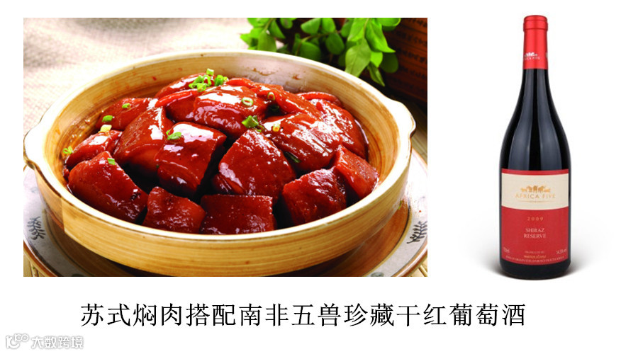 “浓油赤酱”四个字,是一定要用来形容苏式红烧肉的。肥而不腻、酥而不碎、甜而不粘、浓而不咸,这就是苏式红烧肉的特色。这款南非五兽珍藏干红葡萄酒以西拉葡萄酿造而成,香气浓郁且层次多变,黑莓和紫罗兰花香令人愉悦,细腻的香草与黑巧克力香气交织出现,酒体饱满,与苏式焖肉搭配,令人回味无穷。
