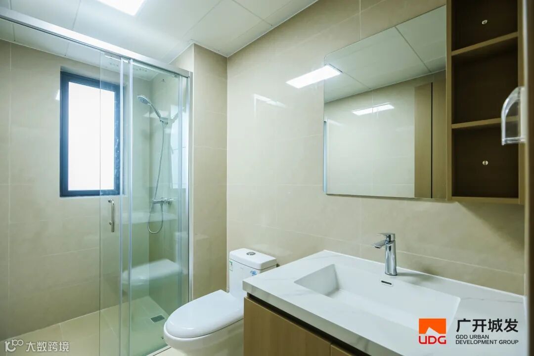 卫生间配齐洗手台、马桶、淋浴屏三件套,排气扇与照明一体化设计,细节处尽显人性化关怀。