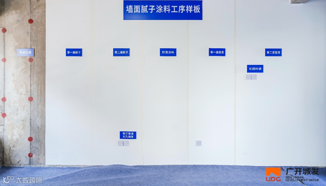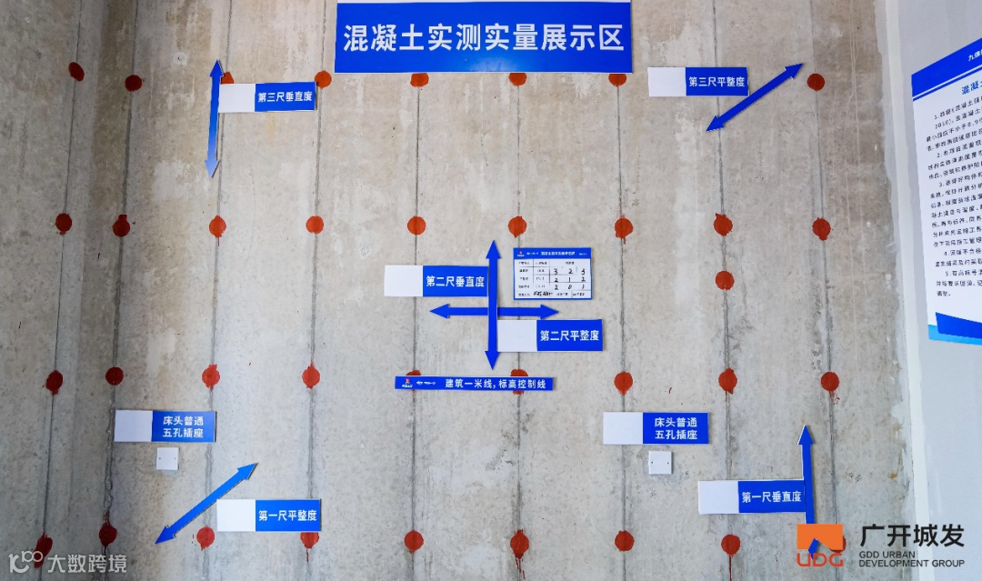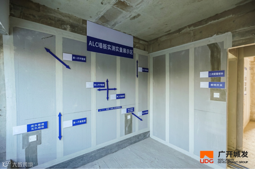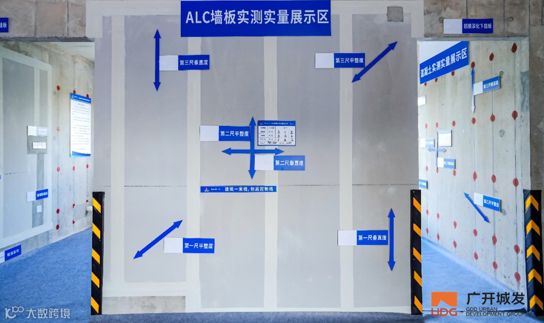 5.以“毫米级”精度,筑牢建筑品质根基。在项目现场,混凝土、ALC内隔墙墙板实测实量管控正以“可视化、标准化”的方式落地:墙面、地面的标识清晰标注了实测数据与管控要点,从平整度、垂直度到开间尺寸,每一项指标都对应着明确的验收标准。