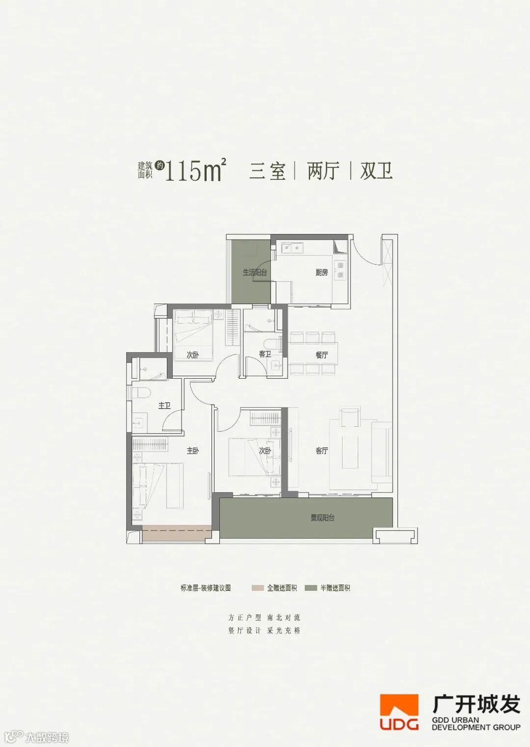 115㎡三室两厅两卫,刚需家庭的优选户型:空间利用率高,三开间朝南的设计,保障了室内充足采光。