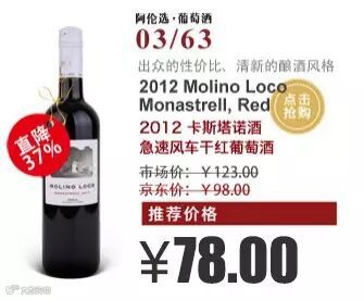 2012年份的卡斯塔诺酒庄风车干红,色泽深红,果味成熟,并带有香料的辛香[阿伦选·葡萄酒京东商城售价为78元]。
