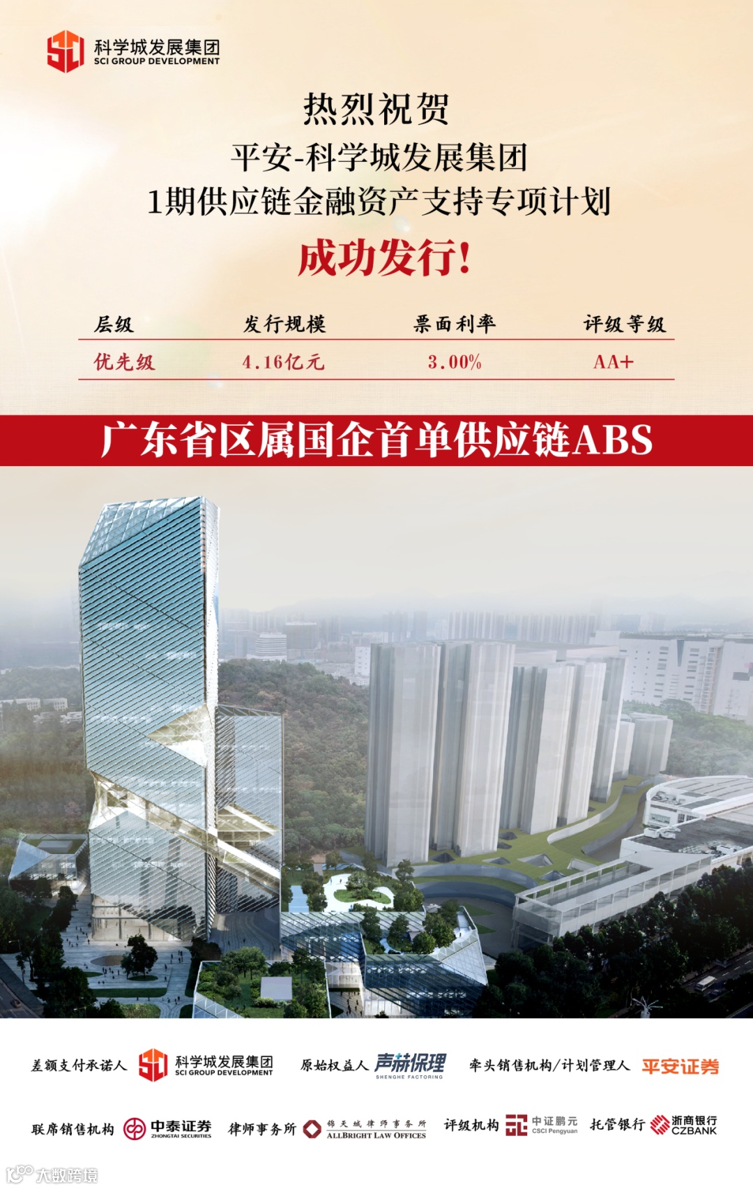 3月11日,发展集团成功发行平安-科学城发展集团1期供应链金融资产支持专项计划,证券简称“科发01优”“科发01次”,增信方式为发展集团提供差额支付承诺,计划管理人/牵头销售机构为平安证券,联席销售机构为中泰证券,募集总规模4.17亿元,优先级4.16亿元,评级AA+,期限1.36年,票面利率3%。