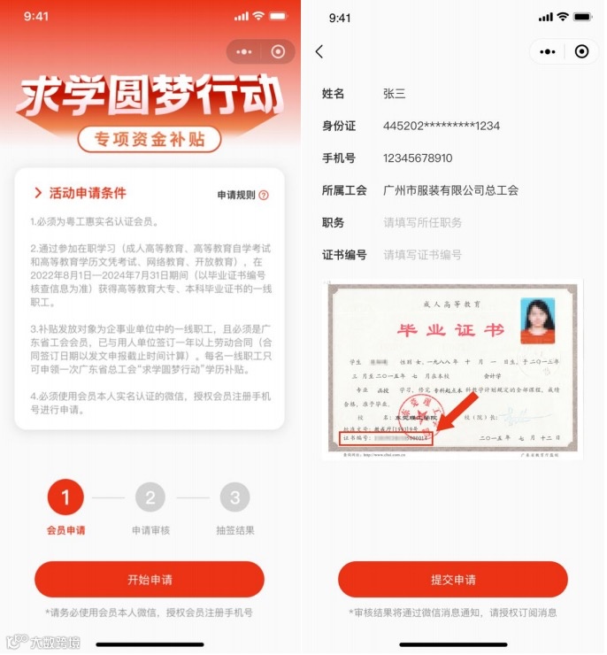 系统验证申请人是否已在「粤工惠」平台实名注册,是否申领过广东省总工会「求学圆梦行动」学历补贴,学历信息是否符合申领条件。校核通过后,则进入各级工会审核。