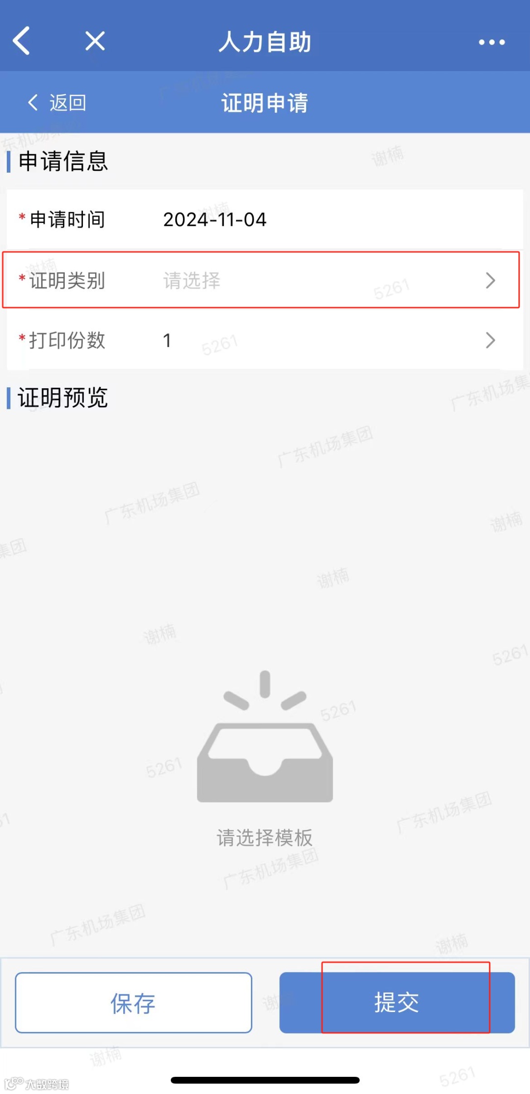 3、选择【证明类别】,浏览证明样式,确认无误后点击【提交】
