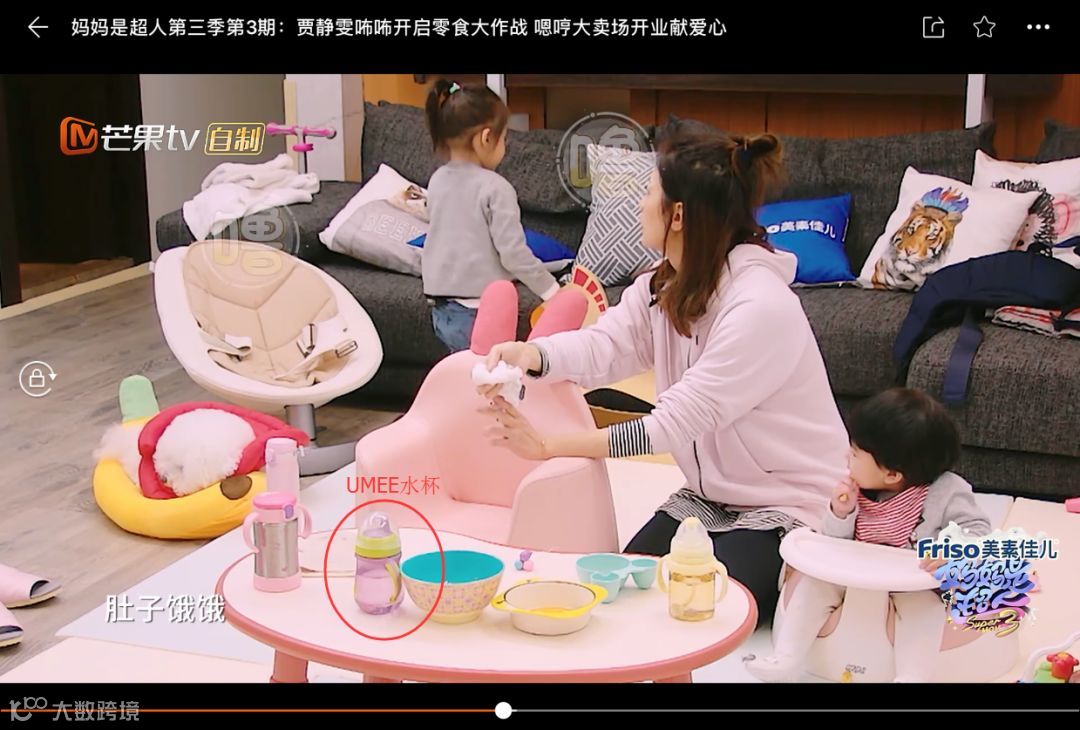 贾静雯参与湖南TV真人秀节目《妈妈是超人》时,咘咘和bo妞的日常用品齐上镜,UMEE奶瓶水杯实力抢镜。