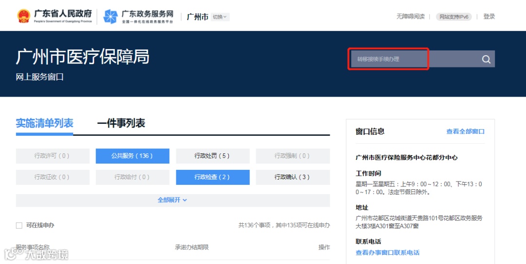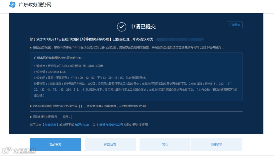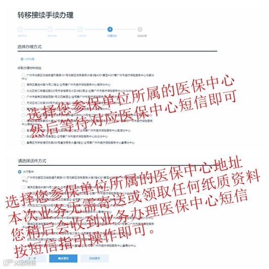 注:广州市转移接续业务全程网上办理,请选择参保单位所属的区医保中心办理业务,该业务全流程无需现场办理或寄送材料。