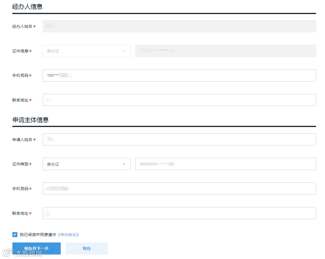 6.第二步,填写表单并上传资料,详细阅读政策告知内容。确认申请人信息与上一步的申请主体信息一致,完成后点击下一步。
