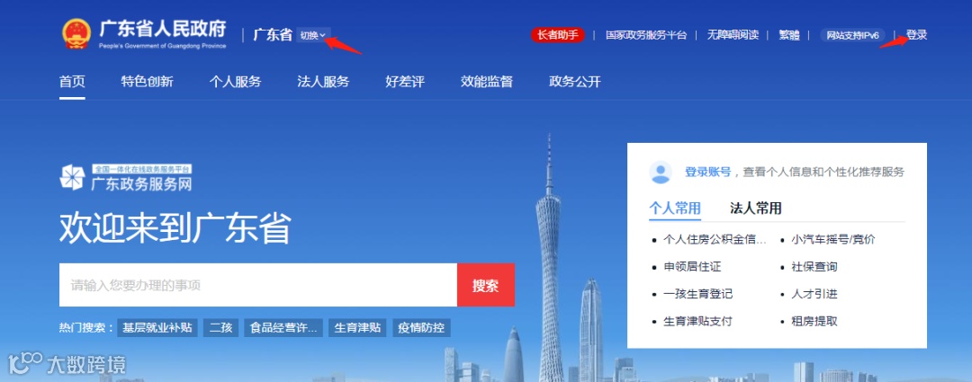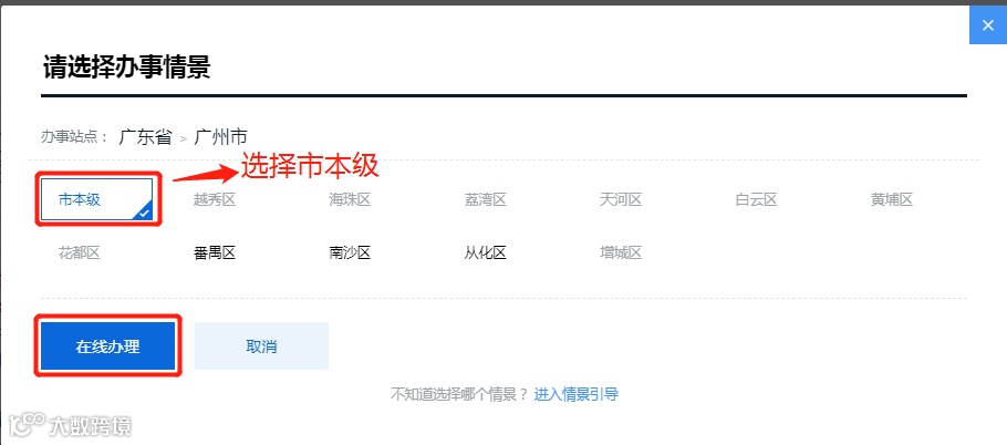 3.在线办理弹窗界面,办事站点选择“广州市(市本级)”(请勿选择到区)并点击“在线办理”按钮进入在线办理界面,在线办理前,请详细阅读办事指南。