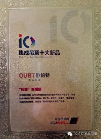 2016年11月10日,由瑞翔传媒主办,中国吊顶网、集成墙面网、中华集成灶网联合承办的“集思明道”第三届(2016)中国集成家居影响力年会在浙江嘉兴富悦大酒店隆重举行,来自集成家居行业的企业领导和嘉宾以及浙江电视台、嘉兴电视台、嵊州电视台等媒体参与了本次颁奖盛典,共同见证了集成家居行业各大奖项的诞生。在当晚的盛典上,欧柏特集成顶墙2016新款“智暖”浴室暖空调系列荣获2016年度集成吊顶十大新品。