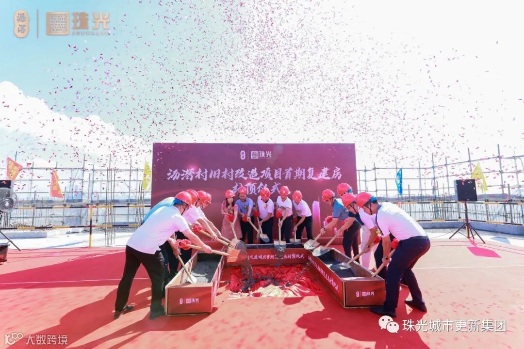 仪式采用同屏互动方式双会场联动,地面与楼顶分别以推杆和浇筑最后一方混凝土形式庆贺,现场礼炮声、鞭炮声响彻云霄。自2020年6月开工建设以来,历经两年多日以继夜的奋战,在今天,迎来了沥滘旧改首个复建房顺利封顶!给予美好祝福,村民们翘首以盼的高质量人居环境触手可及。