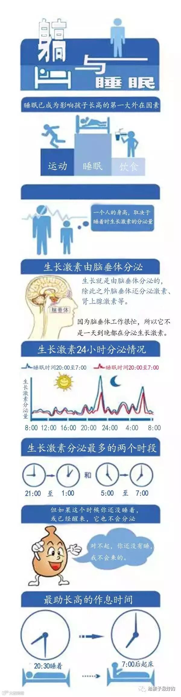 所以生长发育专家的建议是:要孩子长得高,最好在晚上8:30前就上床,最迟不要超过晚9:30,并在早上7点以后再起床。