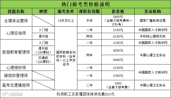 全媒体运营师、心理咨询师、家庭教育管理师、心理倾听师、碳排放管理师、高考志愿填报师