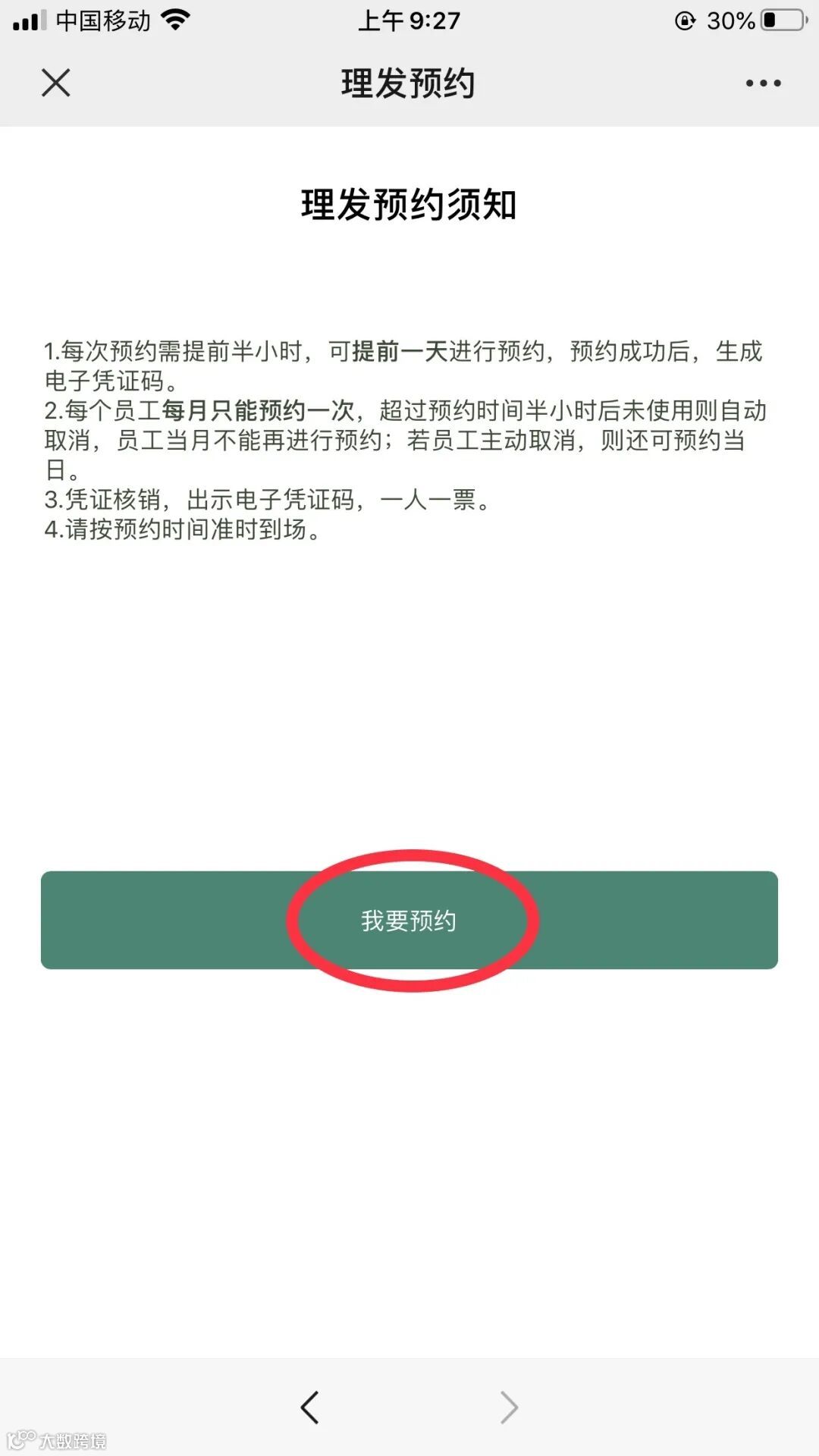 每位员工每月只能预约一次,超过预约时间半小时后未使用则自动取消,员工当月不能再进行预约;若员工主动取消,则当月还可预约。