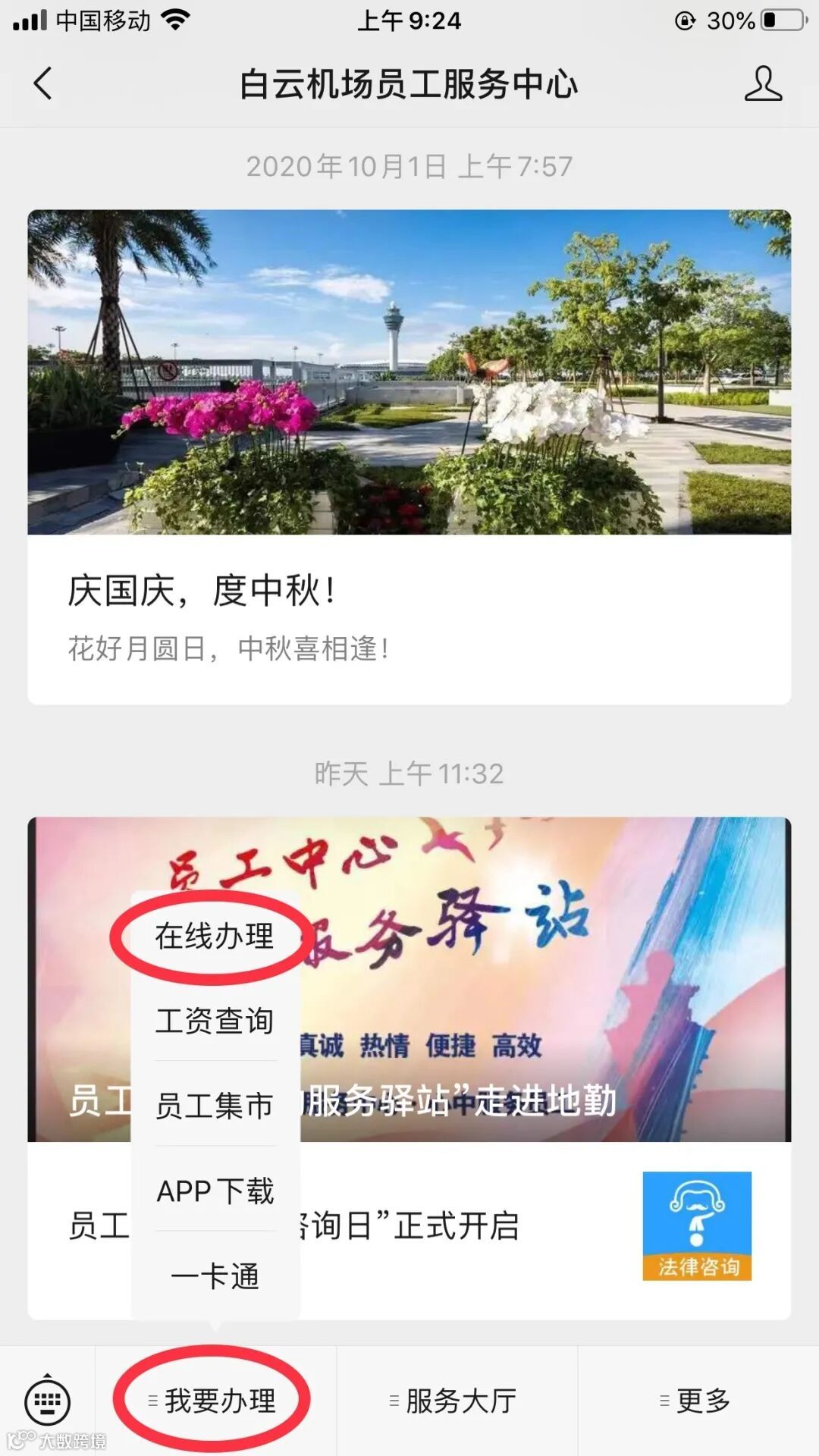 打开员工服务中心微信服务号
