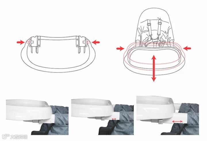餐盘可前后移动并且可拆卸,方便宝宝坐进去,抱出来
