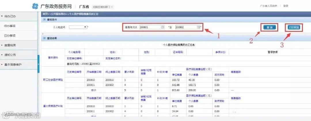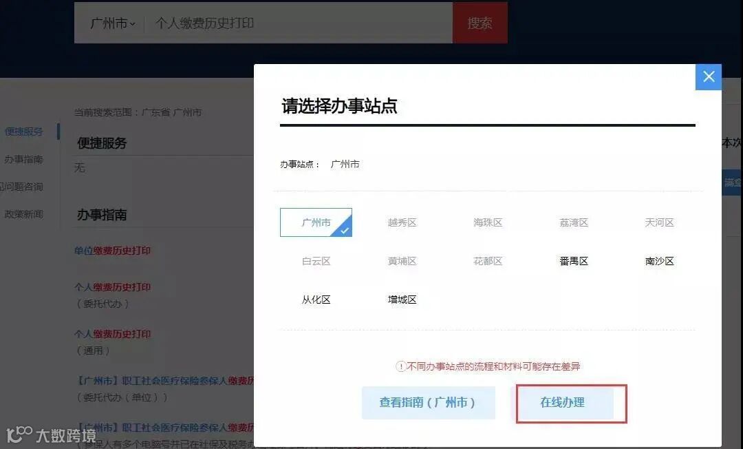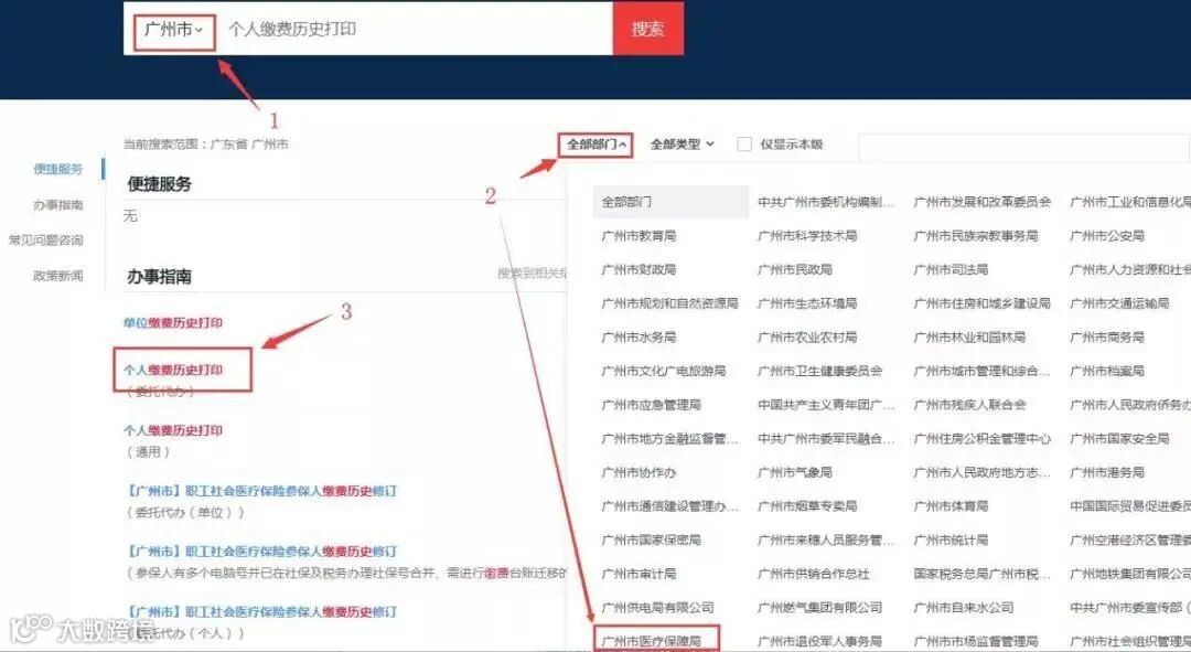 登录“广东政务服务网”。(网址:http://www.gdzwfw.gov.cn),搜索“个人缴费历史打印”事项。(搜索范围选择“广州市”,办理部门选择“广州市医疗保障局”)