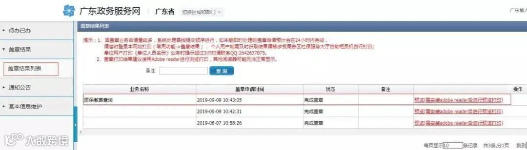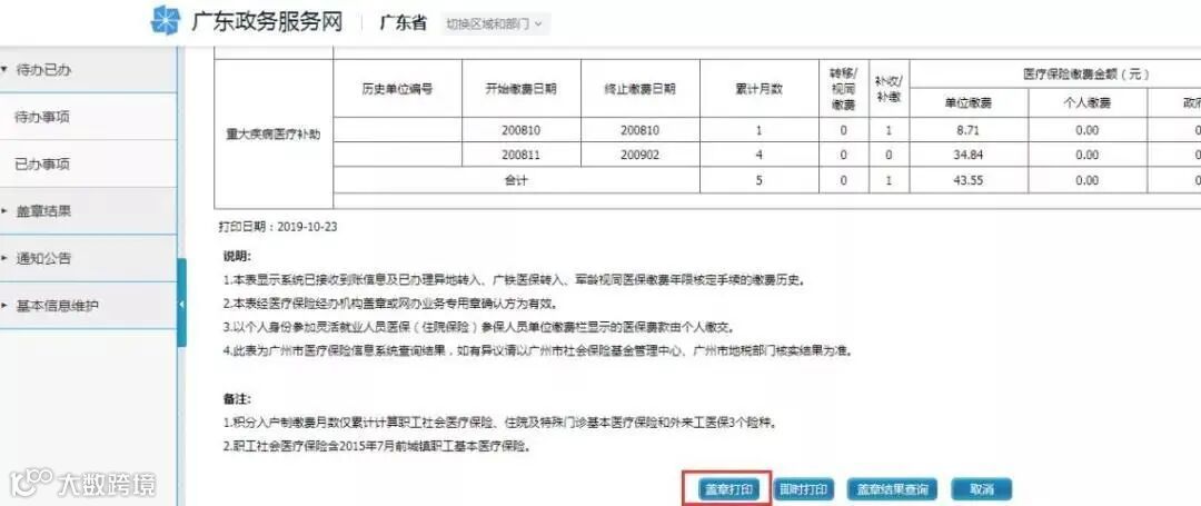 待盖章审核完成后,在左侧菜单“盖章结果”的“盖章结果列表”界面,打印“个人医疗保险缴费历史”。