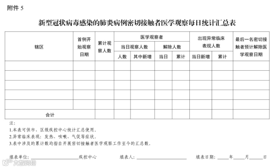 5.新型冠状病毒感染的肺炎病例密切接触者医学观察每日统计汇总表
