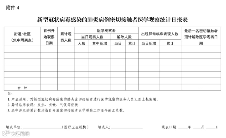 4.新型冠状病毒感染的肺炎病例密切接触者医学观察统计日报表