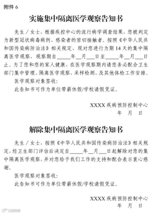6..实施集中隔离医学观察告知书与解除集中隔离医学观察通知书