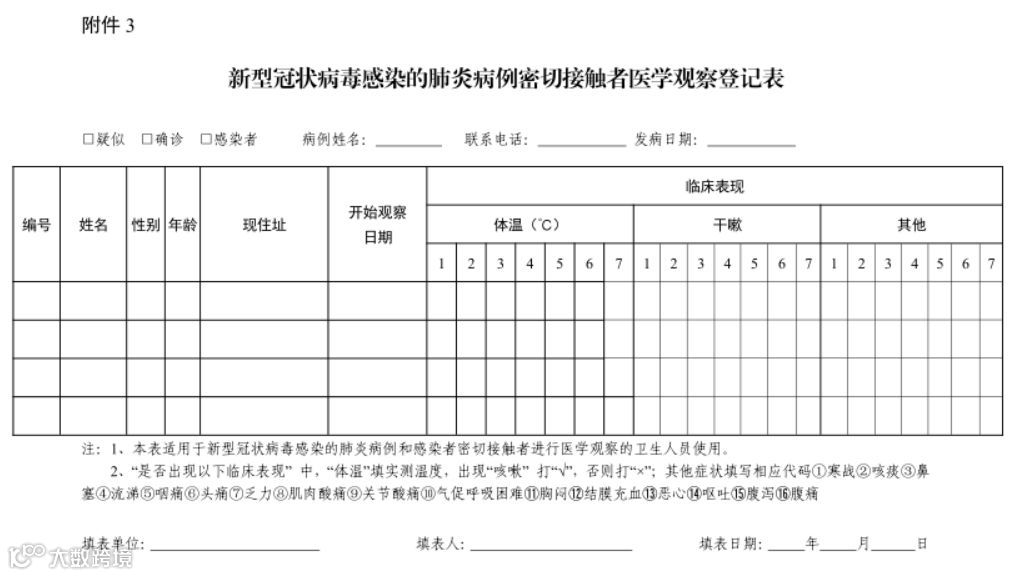 3.新型冠状病毒感染的肺炎病例密切接触者医学观察登记表