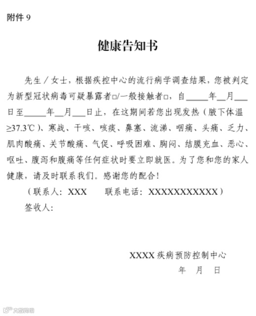 (二)对可疑暴露者和一般接触者开展健康告知。对可疑暴露者和一般接触者,由县级卫生健康行政部门会同相关部门,组织疾控机构专业人员进行健康告知(详见附件 9),嘱其出现发热、咳嗽等症状时要佩戴口罩,及时就医,并主动告知其职业或动物接触情况等。