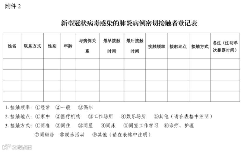 2.新型冠状病毒感染的肺炎病例密切接触者登记表