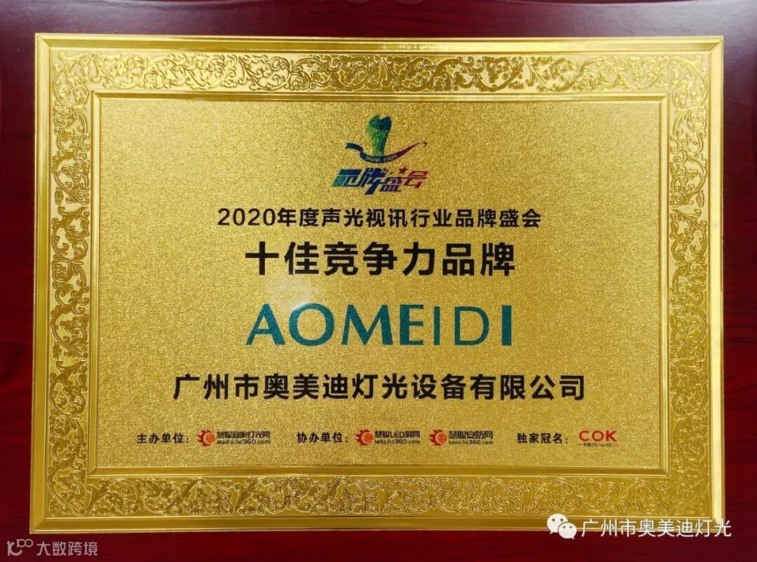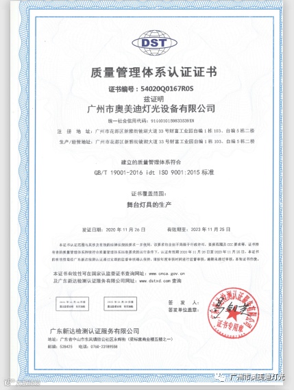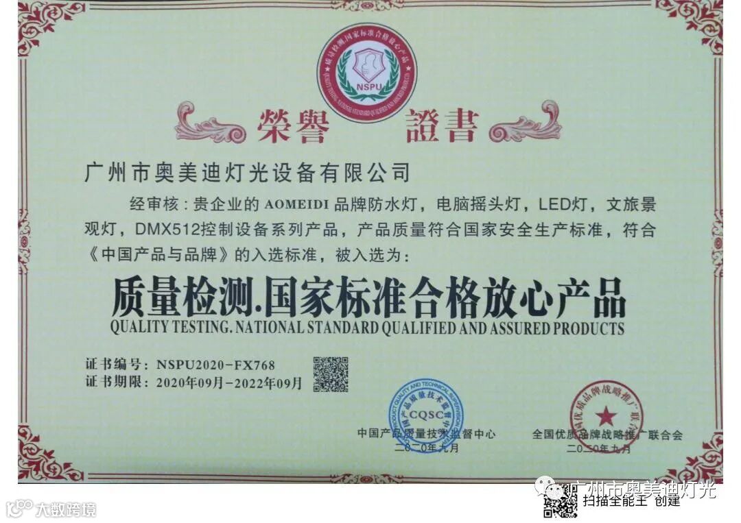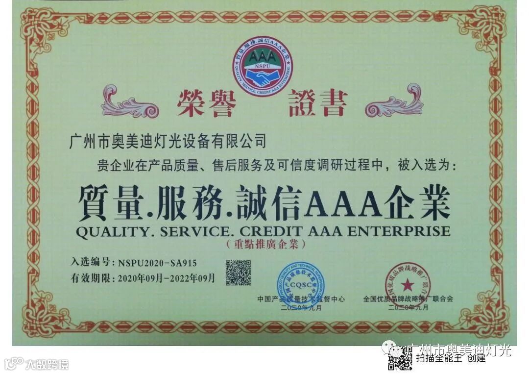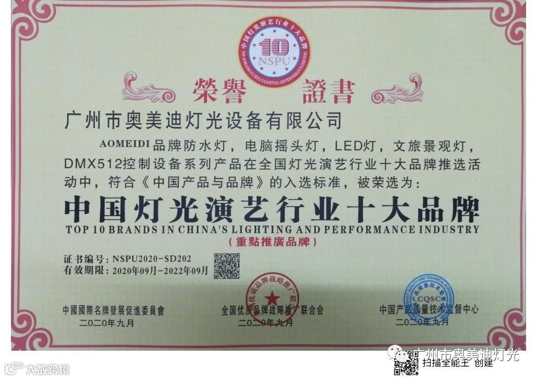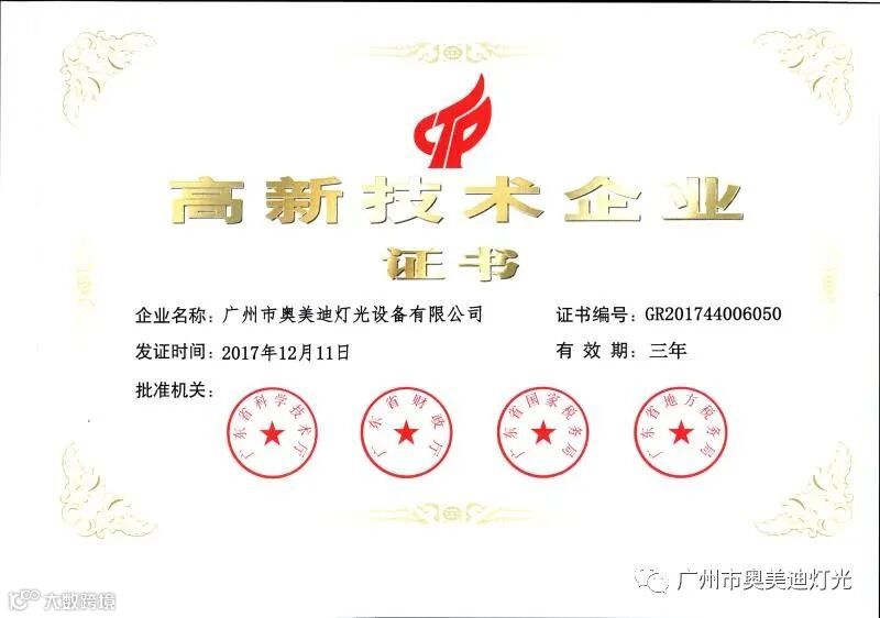 奥美迪灯光是国家高新技术企业,广东省湖南商会演艺设备专委会常务副会长单位,通过了ISO9001:2015质量管理体系认证,知识产权管理体系认证,产品通过了欧盟CE认证和ROHS环保认证,获得十佳竞争力品牌、全国专利技术先进企业、质量.服务.诚信AAA企业、绿色环保推广产品、质量检测.国家标准合格放心产品等证书。