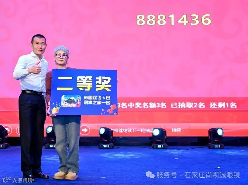 最激动人心的还得是抽奖环节。本次盛会共发出奖品251份。奖品不仅有护理液、隐形眼镜等,更是有韩国游、华为手机以及吉利汽车等豪华大奖。抽奖环节紧张刺激,大家手握奖券,目不转睛地盯着大屏幕,期待幸运之神的眷顾。随着一个个号码的揭晓,中奖者们喜笑颜开,上台领取精美的奖品,现场掌声雷动,为他们送上最真挚的祝福。