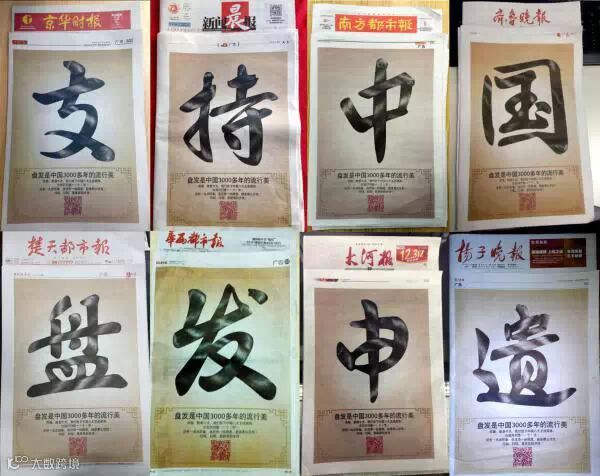 然而,将八份报纸拼在一起,则凑成了“支持中国盘发申遗”一句话。虽然这是一个企业的商业行为。但此次的报纸包版事件,显然得到了大多数网民的支持。不少微博大号都发出了“真土豪!”的感叹。也有人指出,中国文化屡屡遭韩国抢先申遗,这样的大手笔“喊棒子滚粗”实在大快人心。