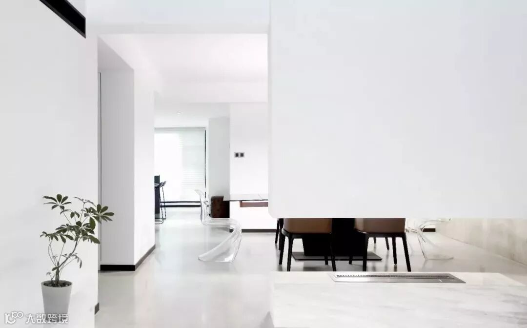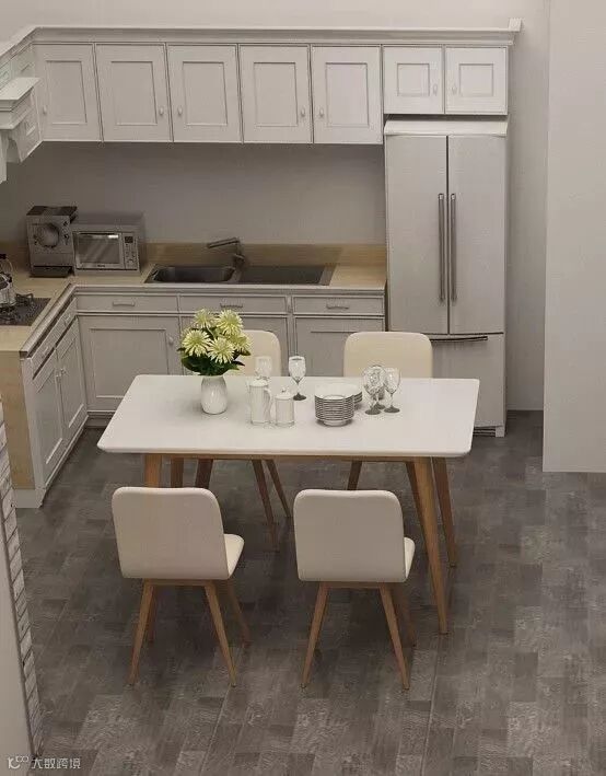 橱柜利用墙面的空间,打造多个实用的吊柜以满足厨房收纳;斯莫餐桌更是将极简美学发挥到极致,一块充满设计感的钢化玻璃板,四条原木色彩的细桌腿,空间上的留白一扫小空间的压迫感。