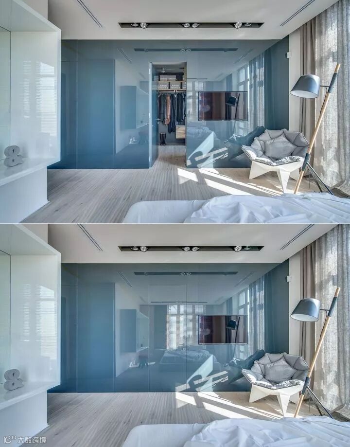 透明的门大放异彩,保持视线,而不是阻隔该区域的距离。但有时也很好的享受一个朴素而简单的卧室,而不一定每一个衣服在视野之内,所以给衣柜设计了拉帘。